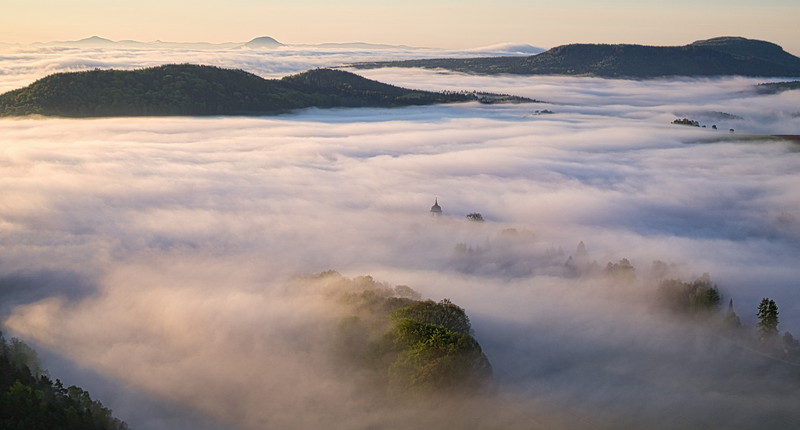 Aussicht in die Nebelfelder, dazwischen eine kleine Kirche in Pfaffendorf, der Lillienstein, Königstein. Seht selbst!!